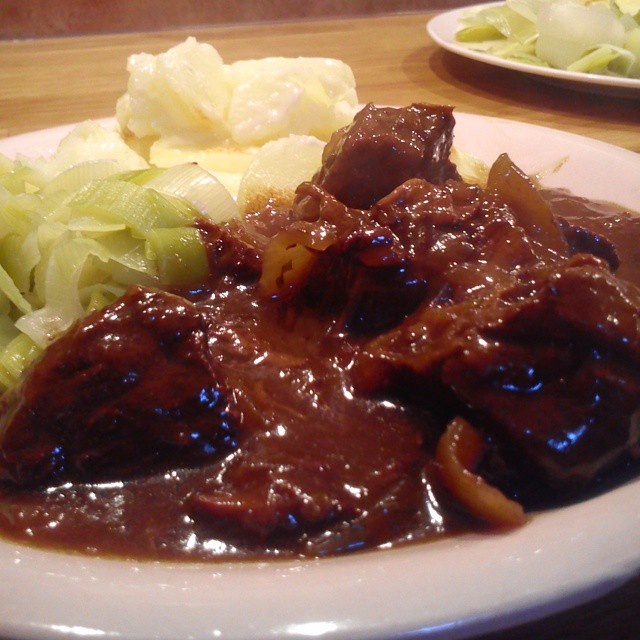 Certains disent qu’on peut faire cette recette à base de porc (ce sont des hérétiques) voire de cheval (ce ne sont pas des jockeys). Moi, c’est le bœuf, point. Pour de bonnes carbonnades flamandes à ma façon, c’est à dire la recette transmise séculairement de grand-mères en mères, au creux de l’oreille secret défense, les ingrédients pour deux mangeur·se·s belges (en conversion, ça doit faire 4/5 français):